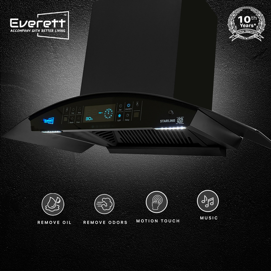 The Everett Starling kitchen chimney is crafted for those who appreciate smart convenience in the kitchen. Featuring advanced 3rd Generation Heat Auto Clean technology and 1600 m³/hr suction power, it ensures a clean, grease-free cooking environment every time. Operated by touch or hand sensor, Starling delivers a hands-free experience while maintaining a sleek, square-shaped matt black design that enhances any contemporary kitchen. The double baffle conical filter traps oil and particles efficiently, making it perfect for Indian cooking styles.